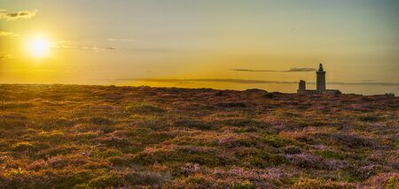 Beautiful summer view of the new lighthouse at Cap Fréhel in Brittany, France, with vibrant heather flowers (Calluna vulgaris) and common gorse (Ulex europaeus)
