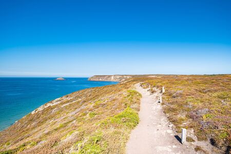 Picturesque panoramic view of Pointe de Toulinguet national park in Brittany, France. Idyllic landscape. Travel destinations, landmarks, sightseeing, tourism, ecology, pure nature, seasons