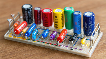 A vibrant collection of electronic components, including various capacitors and resistors, displayed on a circuit board, perfect for showcasing technology and engineering concepts.