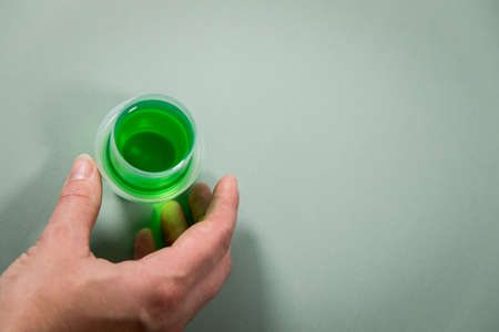 Measuring cup full of disinfectant held with hand with blue latex glove.