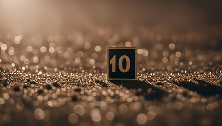 A close-up shot of a golden block number ten resting on a bed of golden sparkles. The background is blurry and out of focus, creating a dreamy atmosphere.
