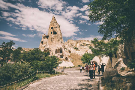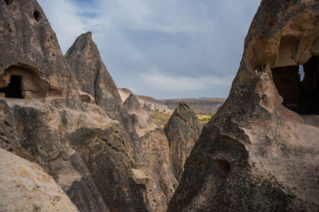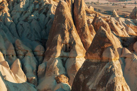 Cave houses and buildings in Cappadocia, Turkey. Stone peaks with doors and windows. Dwelling in real caves. 2019-08-14