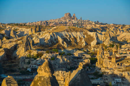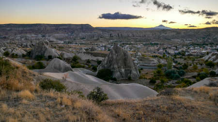 Sunset panoramic view to Goreme city and Gorkundere valley Cappadocia, Turkey