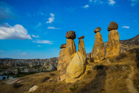 Strange, bizarre Cappadocia. Rocks of amazing shape with rounded bases rise above the yellowed grass. Sharp peaks resembling mushroom caps are visible against the background of a blue cloudy sky.