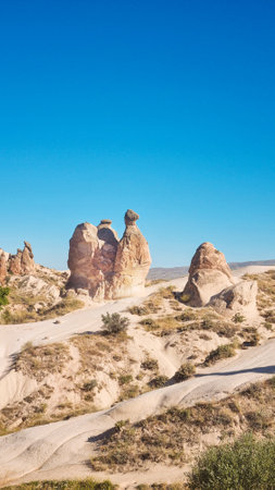 Magical fairy chimneys in the canyon near in Goreme, Cappadocia, Nevsehir Province in the Central Anatolia Region of Turkey