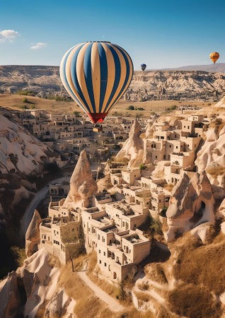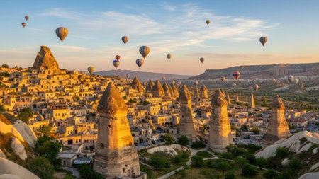 Hot air balloons drift over a landscape of distinctive rock formations and a charming town. The warm sunlight casts long shadows, enhancing the textures and details. The composition captures the vastness of the setting, creating a feeling of wonder. The scene suggests a daytime activity.