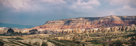 Beautiful mountains rocks landscape. Cloudy sky. Cappadocia, Nevsehir Province, Anatolia Region of Turkey