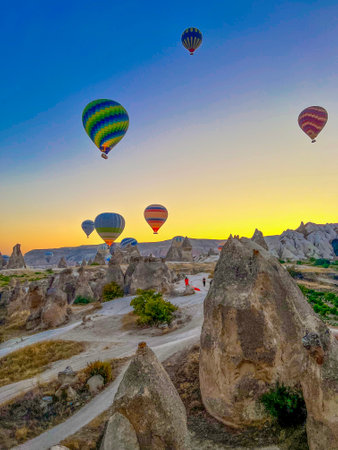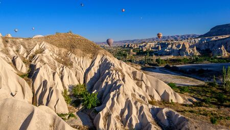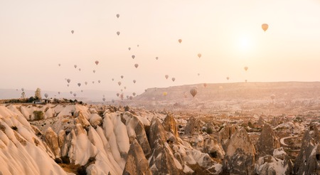 Hot air balloons flying over the famous landscape of Cappadocia, Turkey
