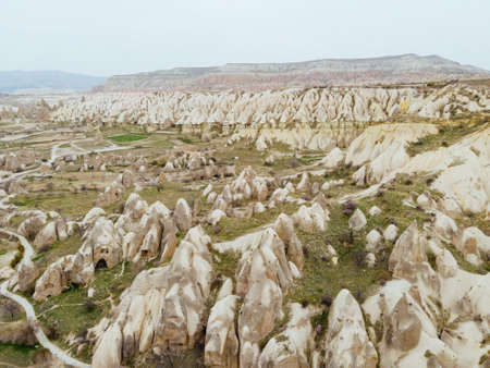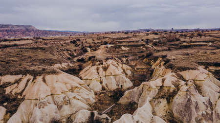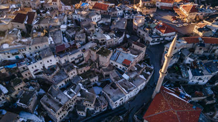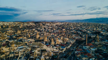 Aerial top down view of Goreme, an old town along the Goreme National Park in Cappadocia. High quality photo
