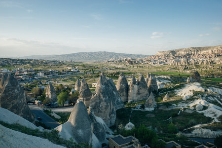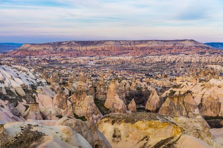 Beautiful landscape with mountains and unusual rock formations. Top view from the observation deck Goreme. Cappadocia, Goreme, Anatolia, Turkey.