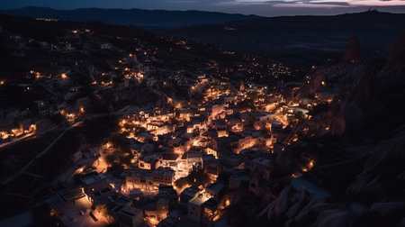 Goreme City at twilight, Famous tourist center of balloon fligths in Cappadocia. Generative Ai
