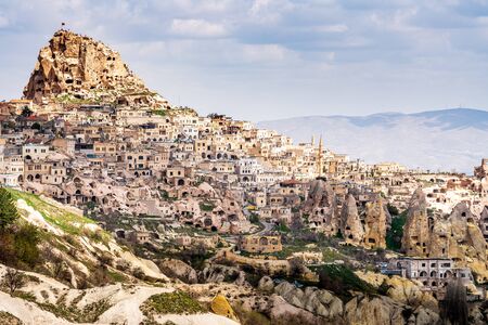 Uchisar town and castle from Pigeon Valley, Cappadocia, Turkey