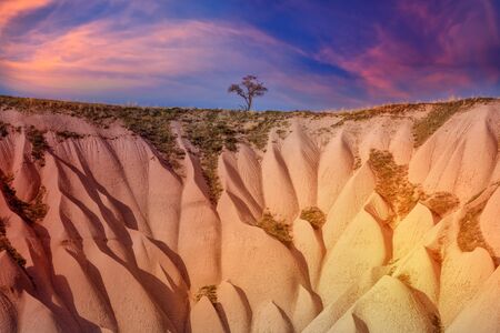 Natural valley with volcanic tuff stone rocks in Goreme in Cappadocia, Central Anatolia region of Turkey, at sunset