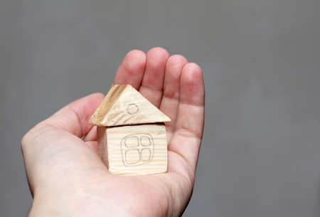 hand in a glove holds a wooden house - concept of health insurance or family doctor banner, copy spice