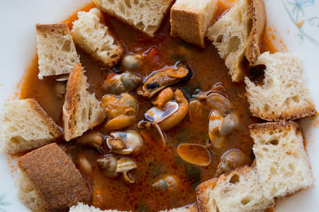 Top view of Napoli Spaghetti including shrimp, clam and squid that covered with pizza dough.