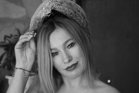 Portrait of a lady in a wicker hat, black-white retro photo.