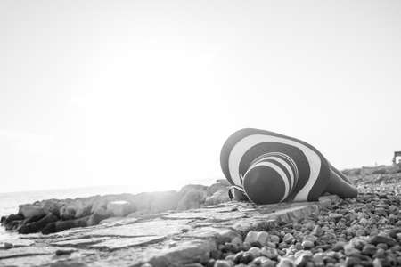 Monochrome image of a woman sunbathing at the beach lying on a rock promenade across pebbles to the top of her sunhat in travel concept.