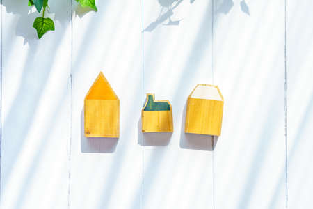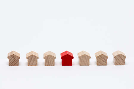 Tiny wooden toy houses in a row, the one in the middle painted red, white background