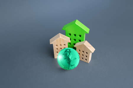 Residential buildings and green globe. Energy efficiency, zero carbon emissions. Environmentally friendly housing, minimal impact on environment. Carbon neutrality. Internet service communication. IoT