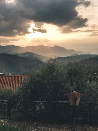 beautiful aerial panorama from the Babadag peak of high mountains rising up over the Mediterranean sea at sunset near Oludeniz Blue Lagoon coast in Turkey during summer