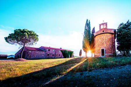 Magic landscape with chapel of Madonna di Vitaleta on a sunny day in San Quirico d'Orcia (Val d'Orcia) in Tuscany, Italy. Excellent tourist places.