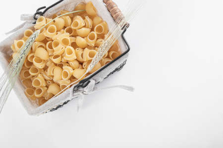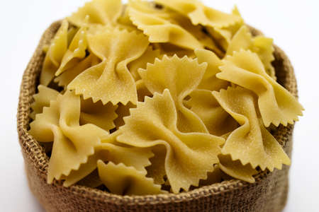 Pasta from durum wheat in a canvas bag on a white background. close-up. Italian pasta