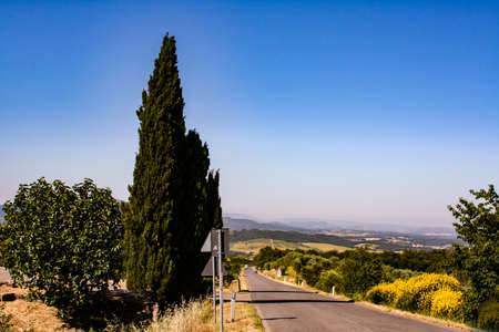 Picturesque Tuscany landscape with rolling hills, valleys, sunny fields, cypress trees along winding rural road, houses on a hill. Tourist visit in Tuscany