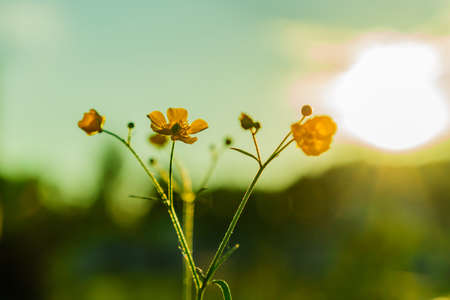 Beautiful yellow wild flowers buttercup flowers in the sunset light. Nature background.