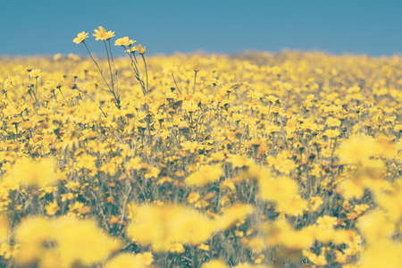 A beautiful shot of a yellow flower field with the blue sky in the background
