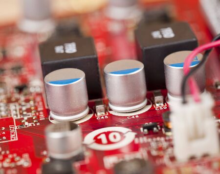 Closeup of electronic circuit board with capacitor yellow, macro capacitor