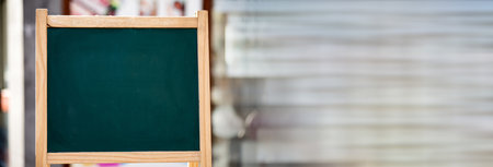 small blackboard slate chalk board clip with space for text menu on wooden surface, empty blank sign