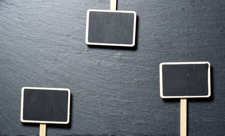 small blackboards slate chalk boards with space for text menu on wooden surface, empty blank sign