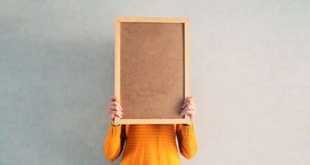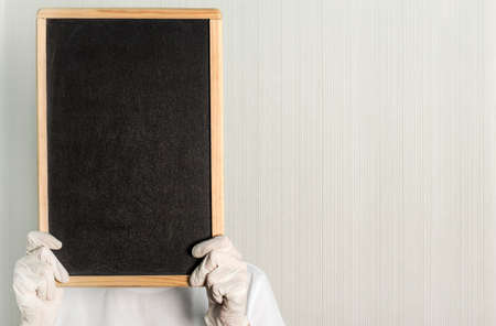 Close-up of a blackboard holding by elderly woman standing in the garden. Selective focus. Blank sign for text