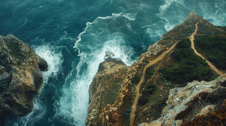An aerial capture of a dramatic cliffside coast, with waves crashing against the rocks below, and a single, winding trail leading to an ancient lighthouse perched at the edge