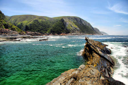 Secluded cove along the Wild Coast with rugged cliffs and blue sea, copy space