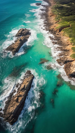 An aerial shot showcases a rugged coastline where vibrant turquoise waves surge against dark, textured rocks. The composition displays dynamic patterns of water and stone with overhead lighting. Suitable for environmental themes, it provides a visual for travel, nature, and coastal projects, offering versatile applications.