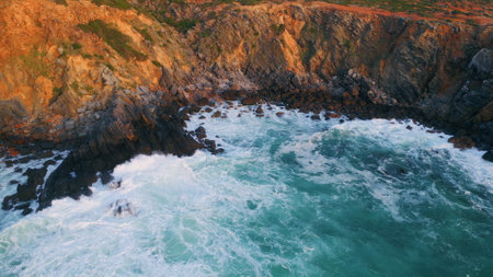 Stormy waves with white foam crashing coastal rocks in slow motion. Aerial view rough sea water breaking on stone coast with splashes sunny day. Picturesque powerful ocean swell washing high cliff