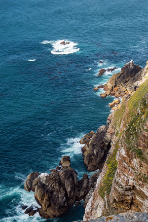 Bird's-eye view. Cape of Good Hope at the southern tip of the Cape Peninsula, South Africa. Powerful ocean surf. Bright sunny summer february day