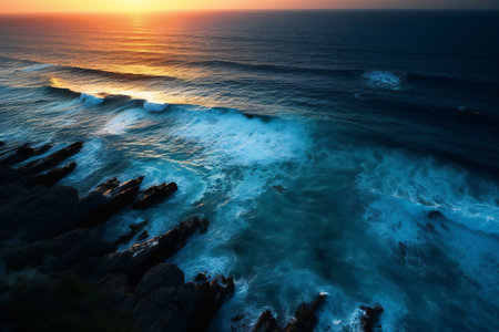 Tranquil seascape crashing waves on rocky coastline, natural beauty generated by artificial intelligence