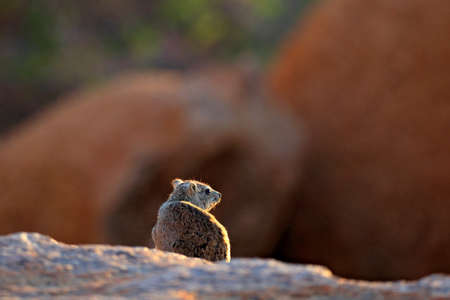 The rock hyrax in natural habitat in Waterberg Plateau National Park. Red rocks of the plateau. Namibia.