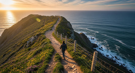 Cliff showing person walking on a coastal cliff path with wildflowers and a fence overlooking the ocean at sunset. resolution