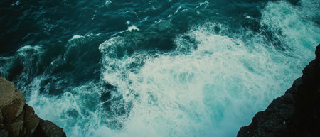 An aerial shot showcases a rugged coastline where vibrant turquoise waves surge against dark, textured rocks. The composition displays dynamic patterns of water and stone with overhead lighting. Suitable for environmental themes, it provides a visual for travel, nature, and coastal projects, offering versatile applications.