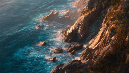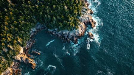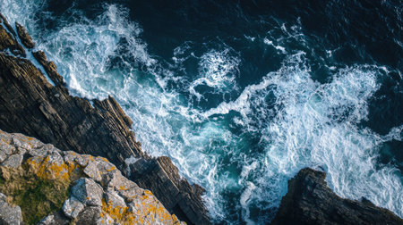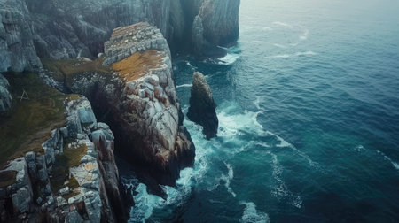A stunning aerial view of a cliff by the ocean, where the fluid water meets the natural landscape, creating a picturesque and tranquil scene under the open sky AIG50