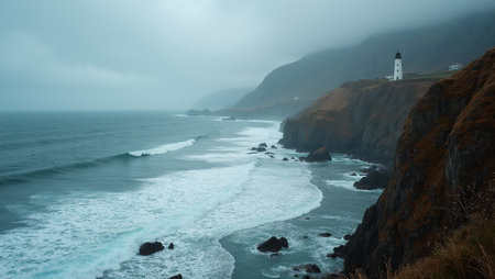A picturesque lighthouse sits on a rugged cliff, overlooking the turbulent sea. Waves crash against the rocks, creating a striking contrast as twilight descends over the landscape.
