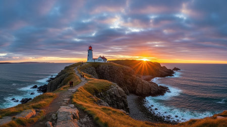 A tranquil sunset scene featuring a lighthouse overlooking rocky cliffs and calm waters. The serene atmosphere enhances nature's beauty at dusk.