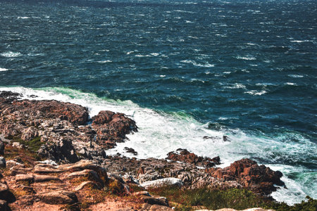 Bird's-eye view. Cape of Good Hope at the southern tip of the Cape Peninsula, South Africa. Powerful ocean surf. Bright sunny summer february day