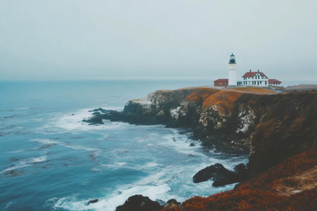 Coastal lighthouse standing tall on a cliff overlooking rough sea and endless sky