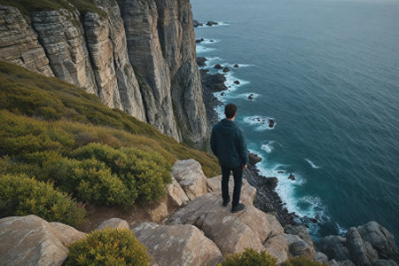 Hiker standing on cliff enjoying breathtaking ocean view, inspiring travel and adventure concept