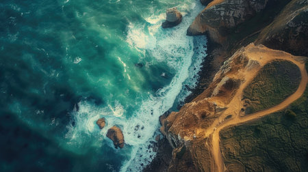 Aerial View: Dramatic Cliffside Coast with Crashing Waves and Path to Ancient Lighthouse