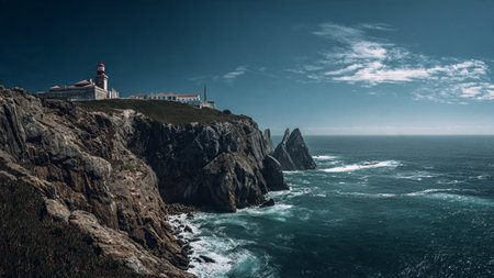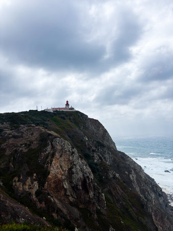 A dramatic coastal scene with a lighthouse perched on a cliff above the stormy Atlantic. Farol do Cabo da Roca
